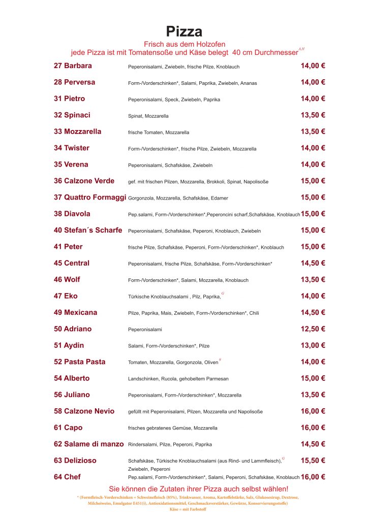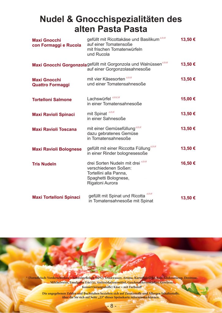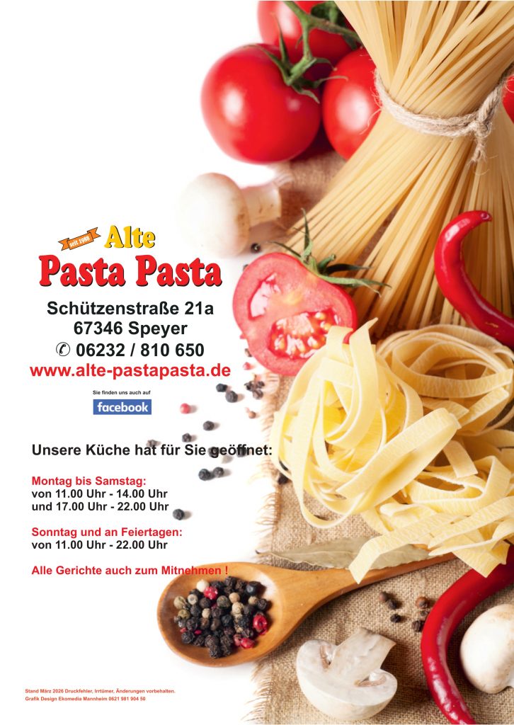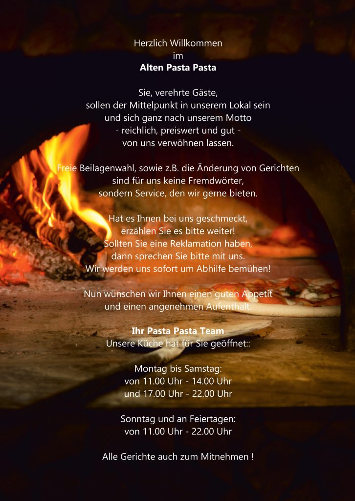 Liebe Gäste, unsere Website befindet sich derzeit noch im Aufbau. Bis dahin finden Sie hier vorerst unsere Speisekarte und aktuellen Angebote. Bei weiteren Anliegen erreichen sie uns unter: 06232 – 810650 altepastapasta@hotmail.de